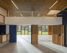 L’équipement se compose d’une salle de 220 m² avec un parquet en bois, d’un bar, d’une cuisine adaptée pour traiteur et d’une terrasse de 246 m² donnant sur une prairie.